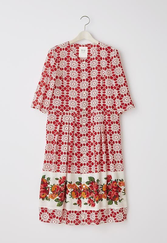 タテ糸にシルクを使用してしなやかなドレープ性を出して綿の光を抑えた軽やかな素材。アンティークレースと大輪の薔薇をパネル状にレイアウトした、大胆でレトロな雰囲気のある柄です。新潟の工場で手捺染しました。手捺染とは、熟練の職人さんが版画のように1枚ずつ型を重ねてハンドプリントする事です。