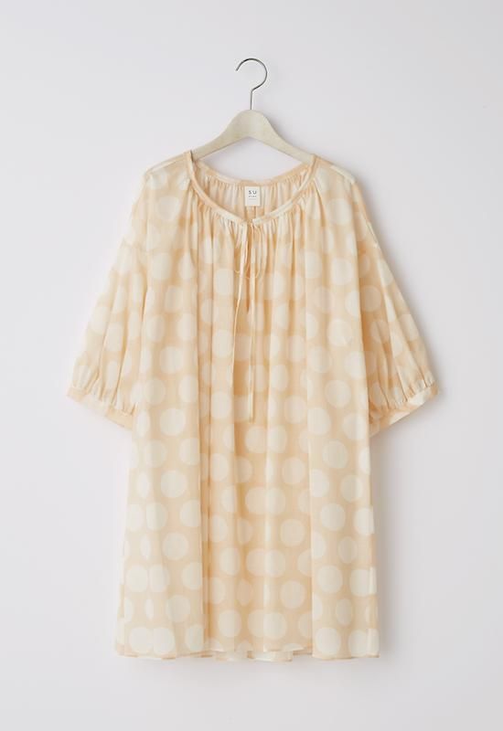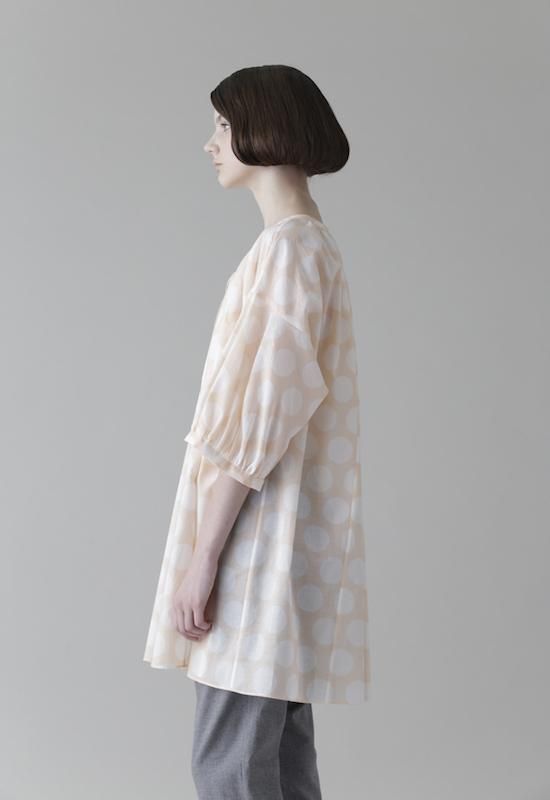 綿のローン地に2回タンブラー加工を施し、インド綿のように肌触りを良くエアリーに仕上げました。大きめなドット柄は、新潟のプリント工場で手捺染しました。手捺染とは、熟練の職人さんが版画のように1枚ずつ型を重ねてハンドプリントする事です。