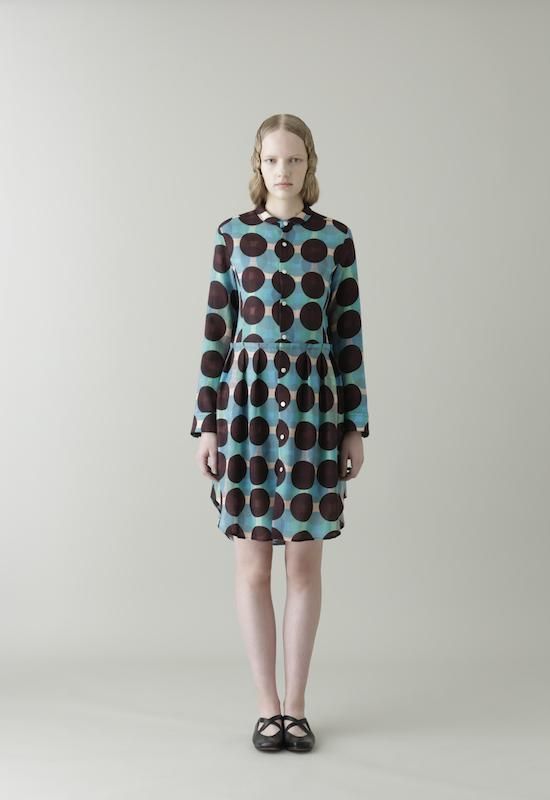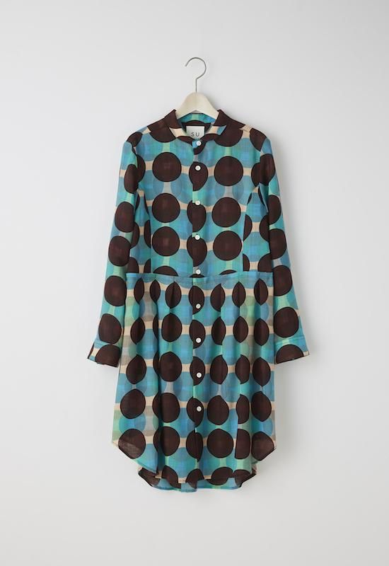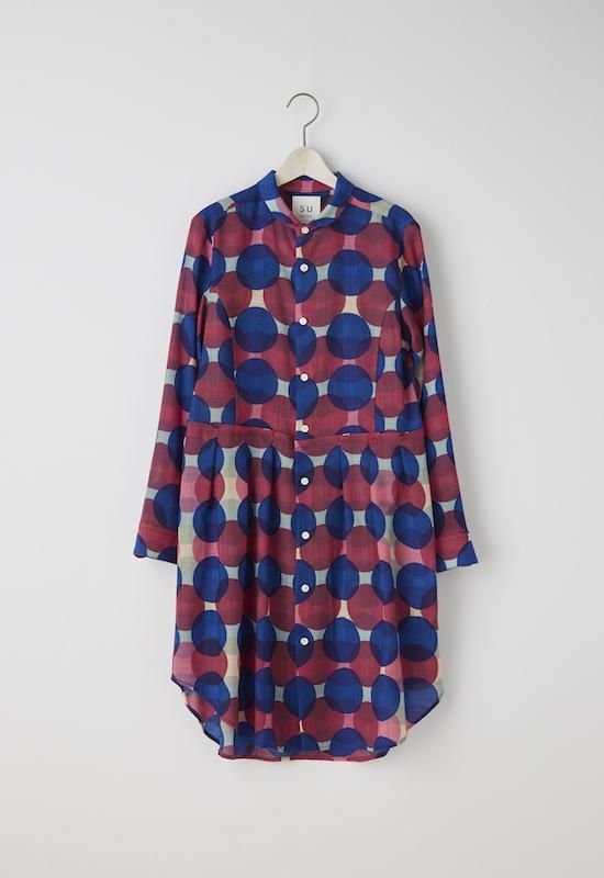 薄いウールビエラに軽い縮絨をかけてた素材に、薄い色のサークル柄を重ねて透明水彩画のように手捺染でプリントした素材。色の重なりが独特な深みを出しています。手捺染とは、熟練の職人さんが版画のように1枚ずつ型を重ねてハンドプリントすることです。