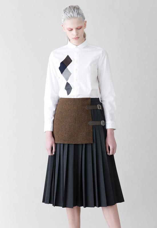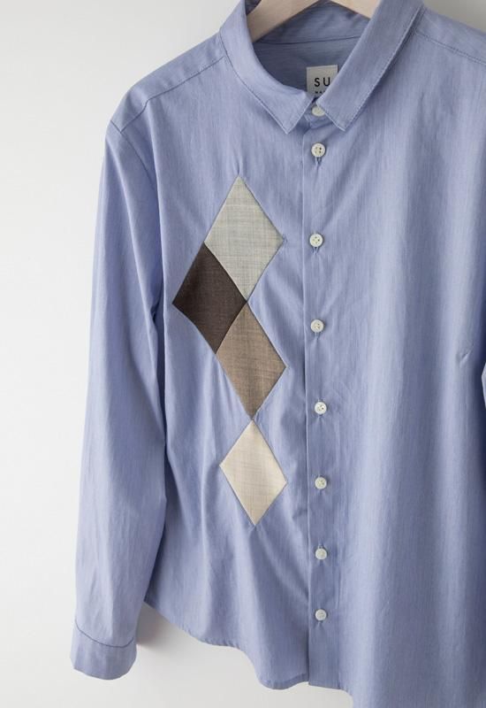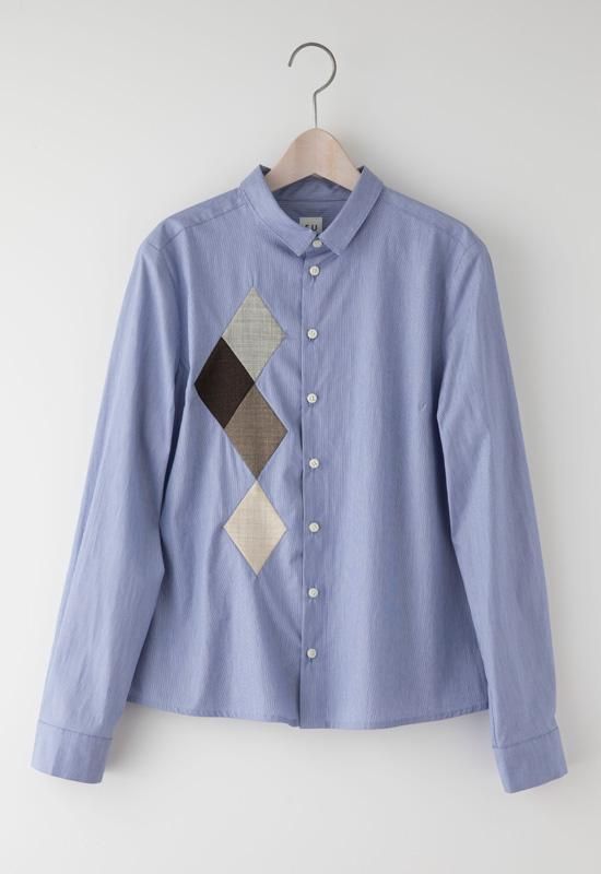 ヘアラインのストライプは細番手の綿糸を高密度で織り、仕上げにシルケット+柔軟+カレンダ-加工することで光沢感としなやかな風合いに仕上げました。無地の綿は、オーガニックコットンを使用した膨らみのあるタイプライターです。メンズテイストなウールトロで作ったダイヤのモチーフがアクセントになっています。