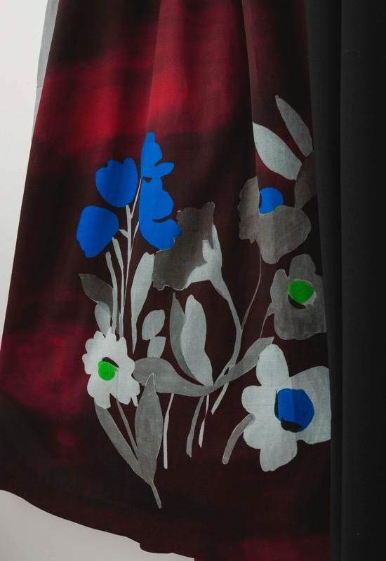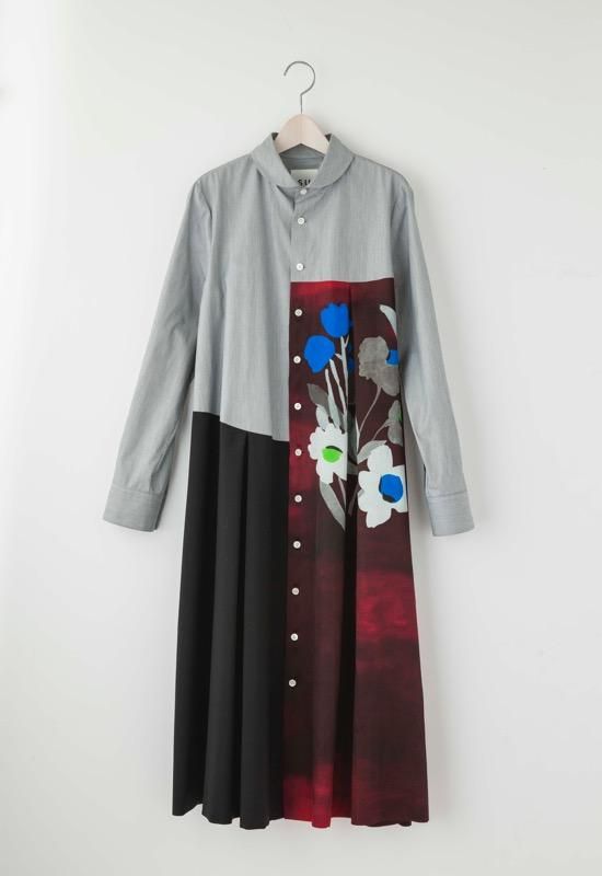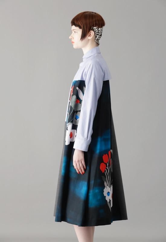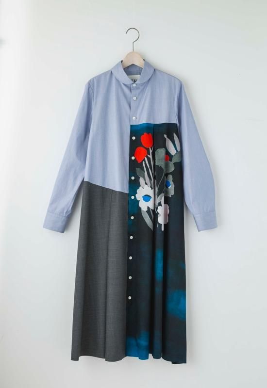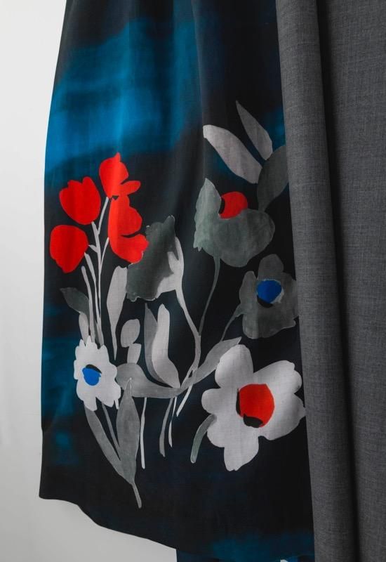 光沢のあるキュプラコットンサテンに水彩画のように色の重なり感のある大きな花の絵をリアルに表現しました。透明感ある花柄とウールやヘアラインシャツ地の組み合わせがコントラストを生みながら綺麗に調和しました。