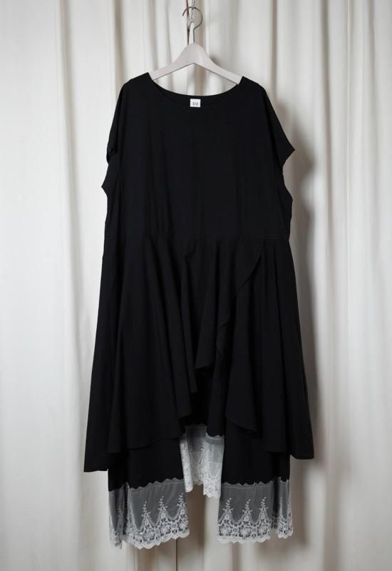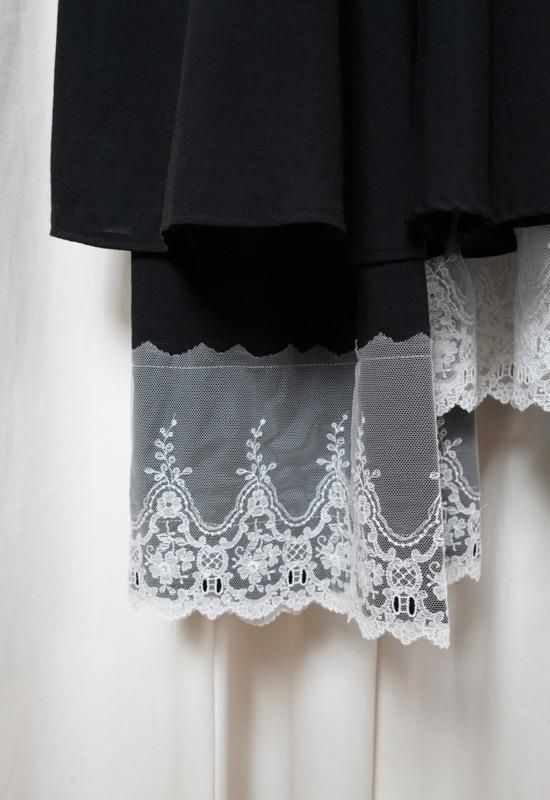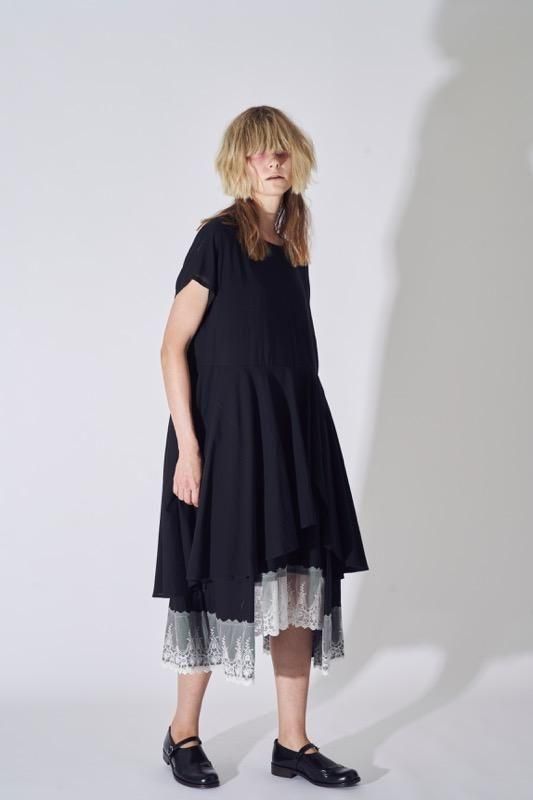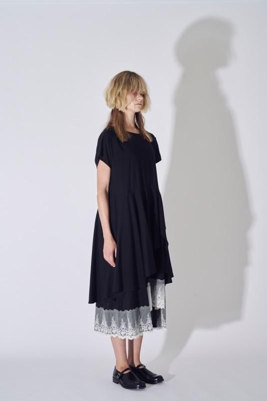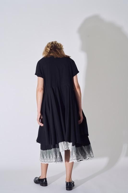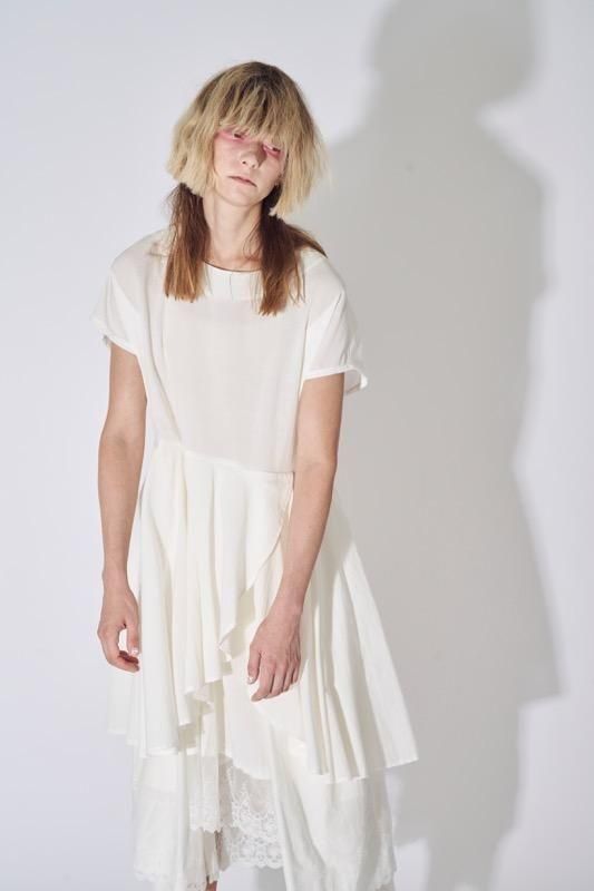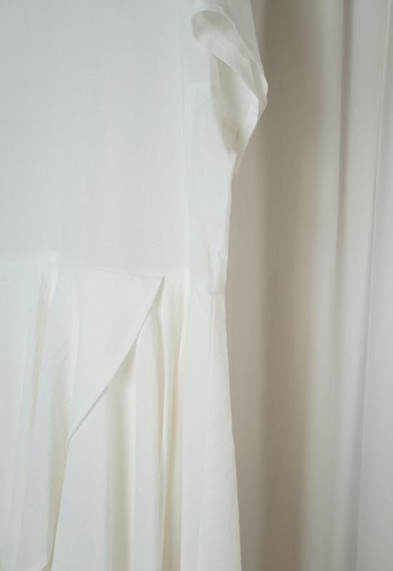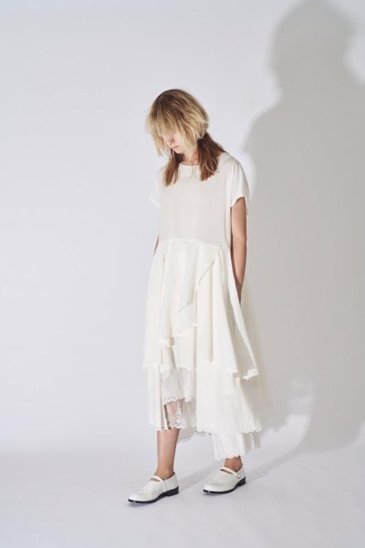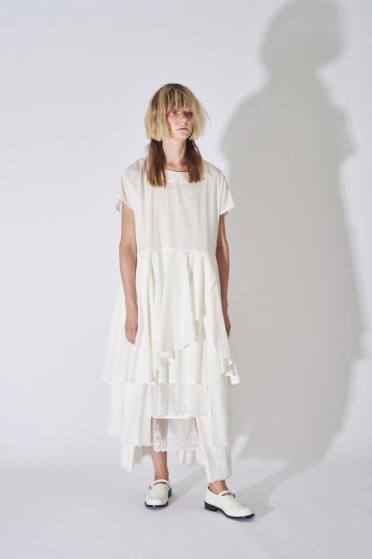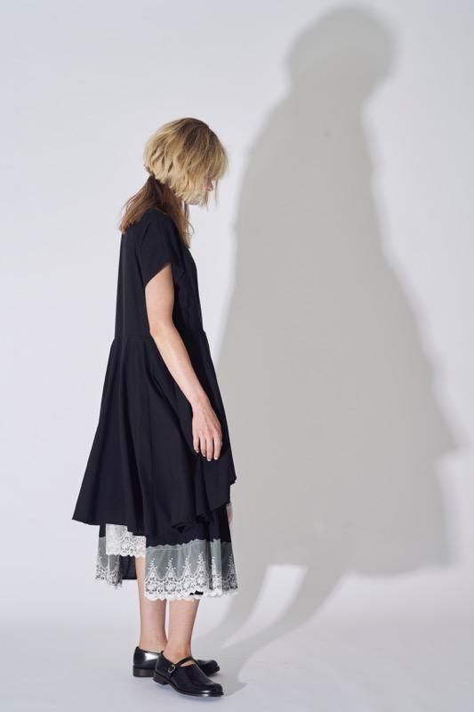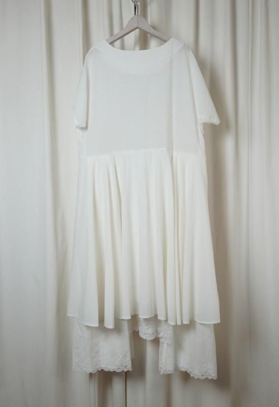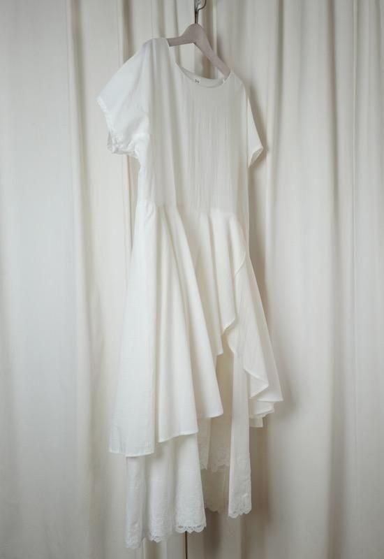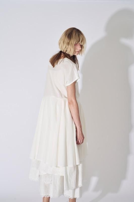 綿シルクローンを何回も洗いこみ、陰干ししてナチュラルな風合いと光沢を持たせた素材です。北関東でエンブロイダリーレース機を使用して昔ながらの緻密なチュールレースを作り、組み合わせてノスタルジックなムードに仕上げたワンピース。