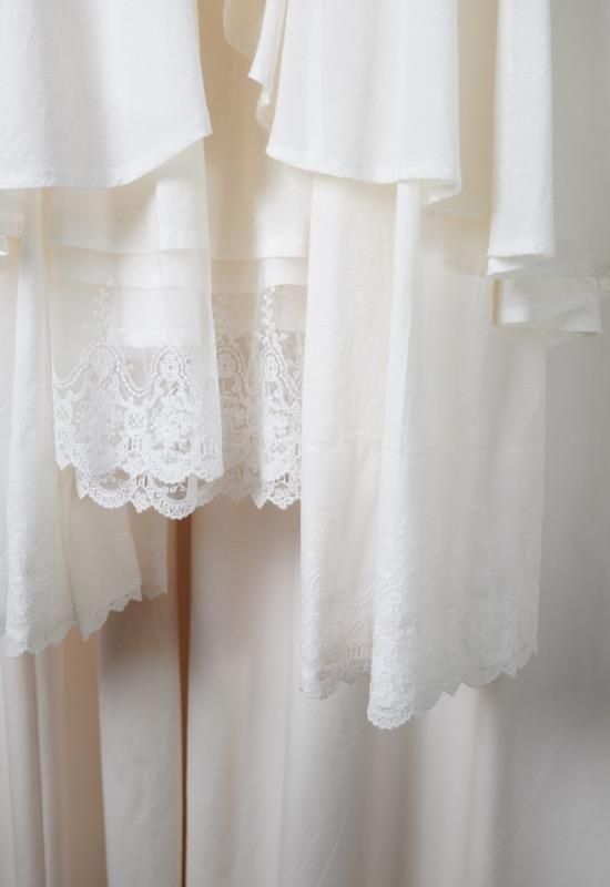綿シルクローンを何回も洗いこみ、陰干ししてナチュラルな風合いと光沢を持たせた素材です。北関東でエンブロイダリーレース機を使用して昔ながらの緻密なチュールレースを作り、組み合わせてノスタルジックなムードに仕上げました。
