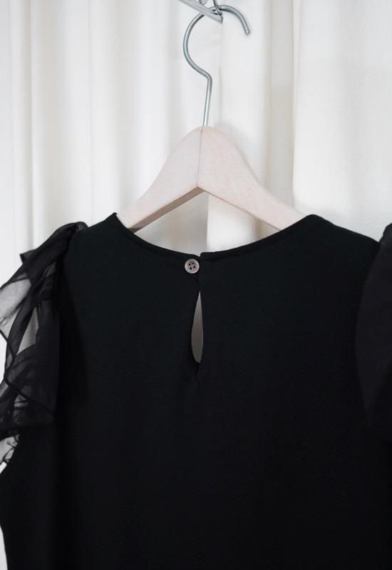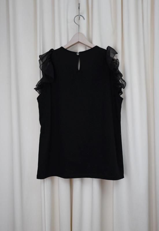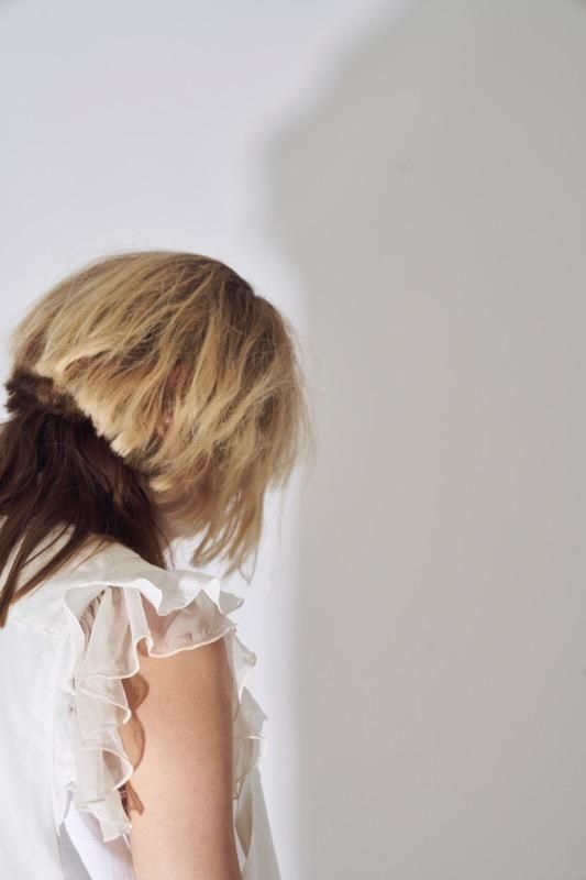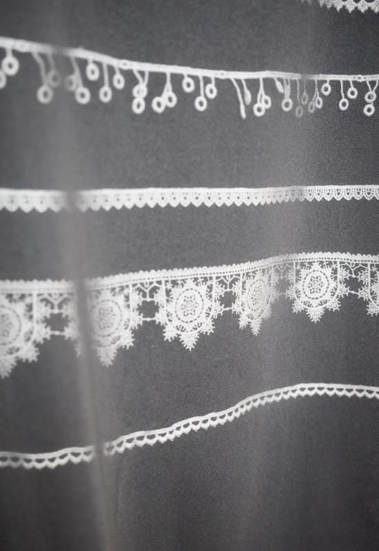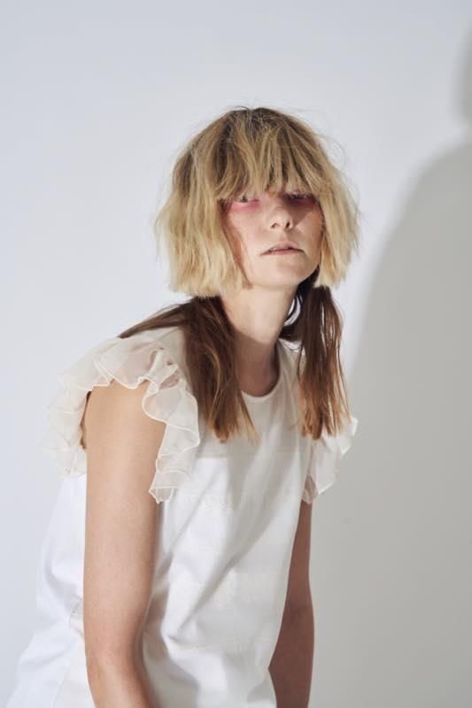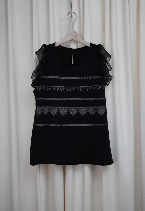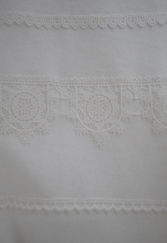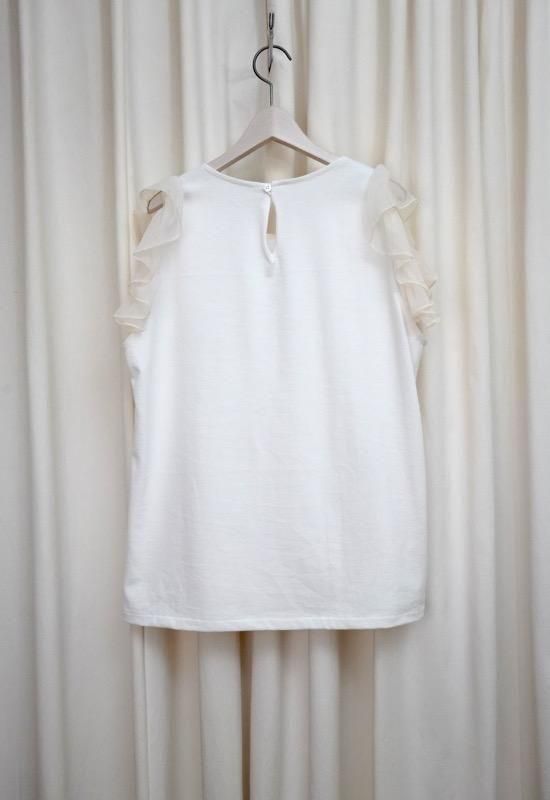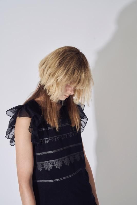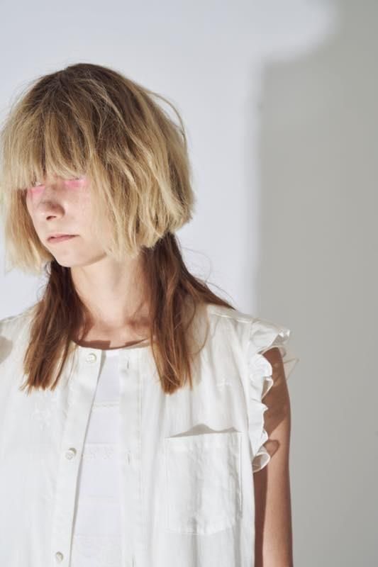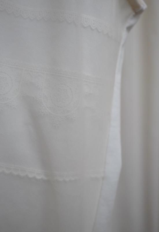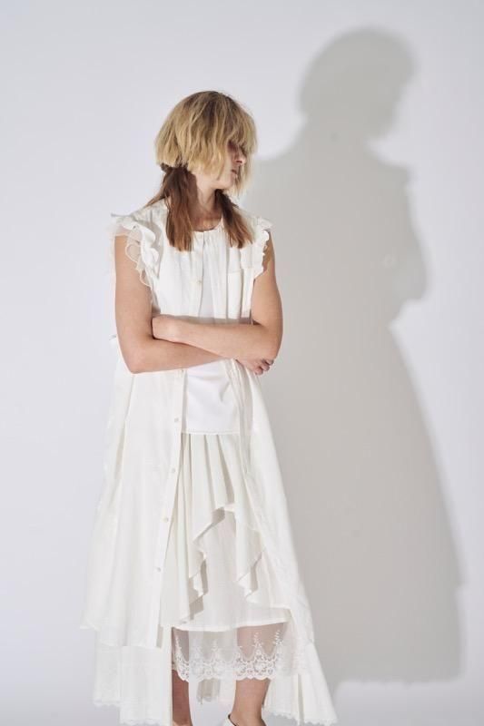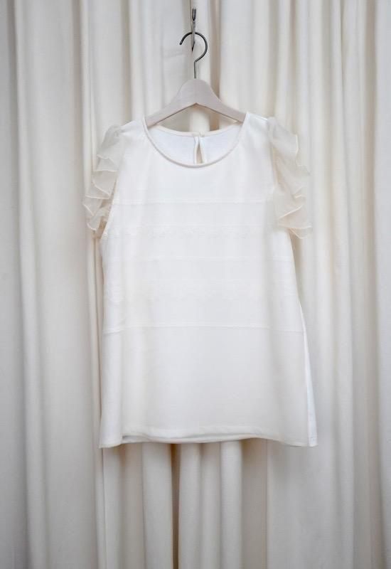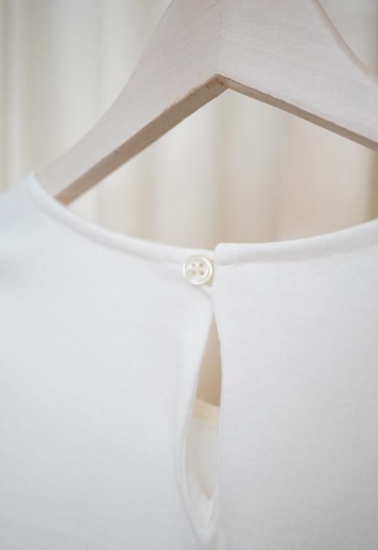 ドライタッチで軽量な綿天竺に様々なエンブロイダリーレースをあしらい、極細のポリエステル天竺で覆いました。曇りガラスのようにシルエットが透けて見えるトップスです。