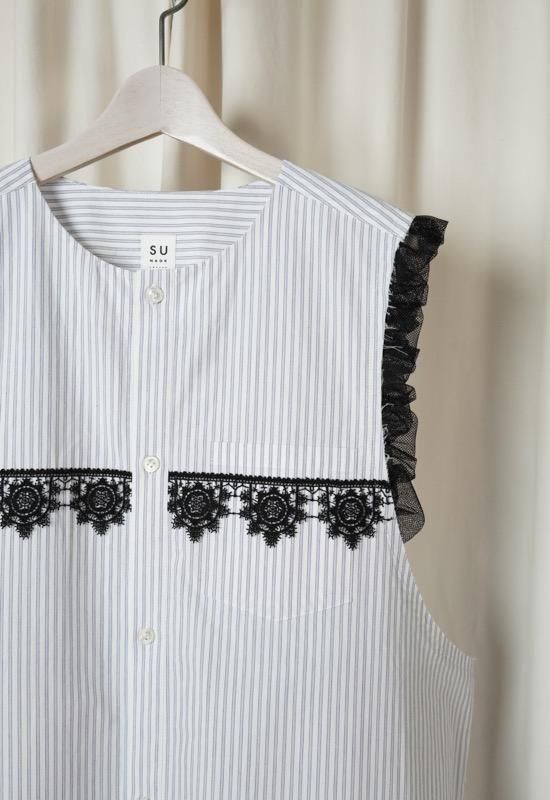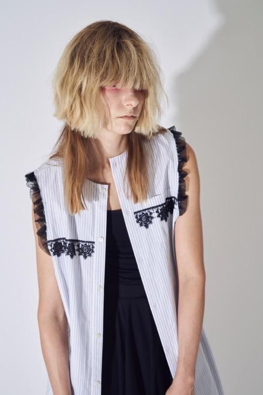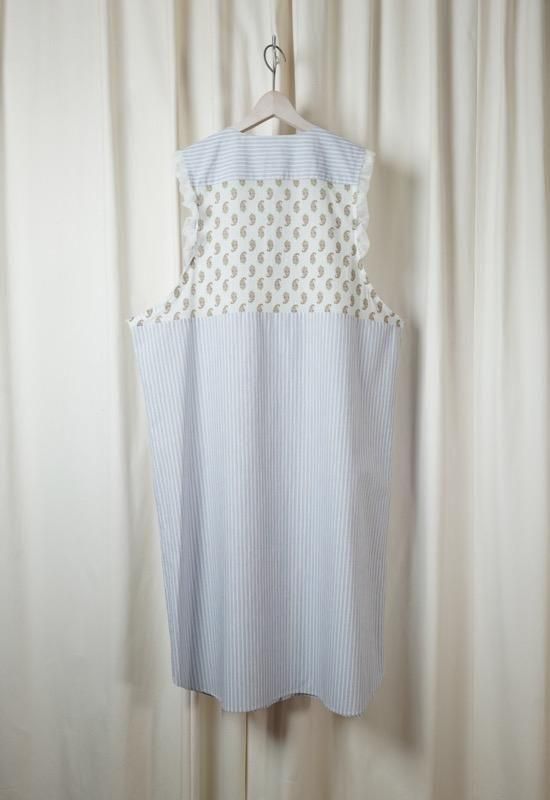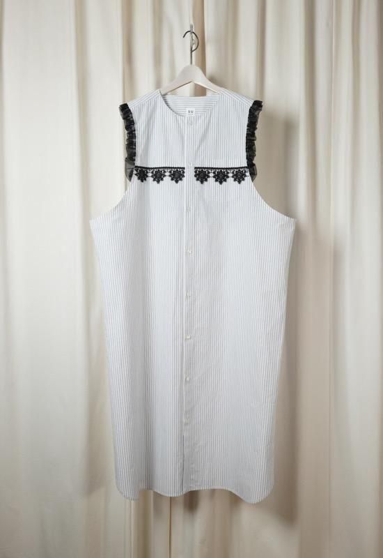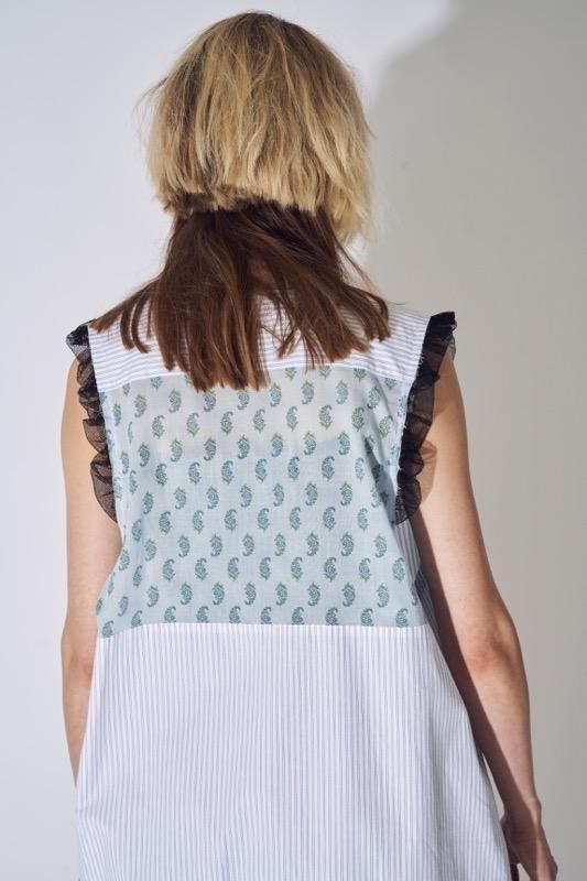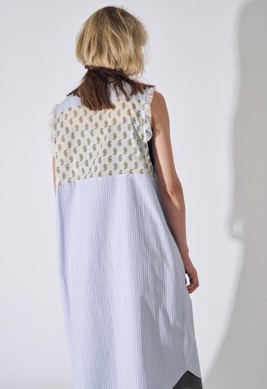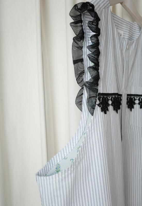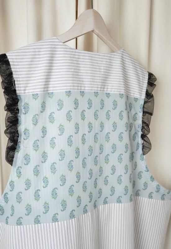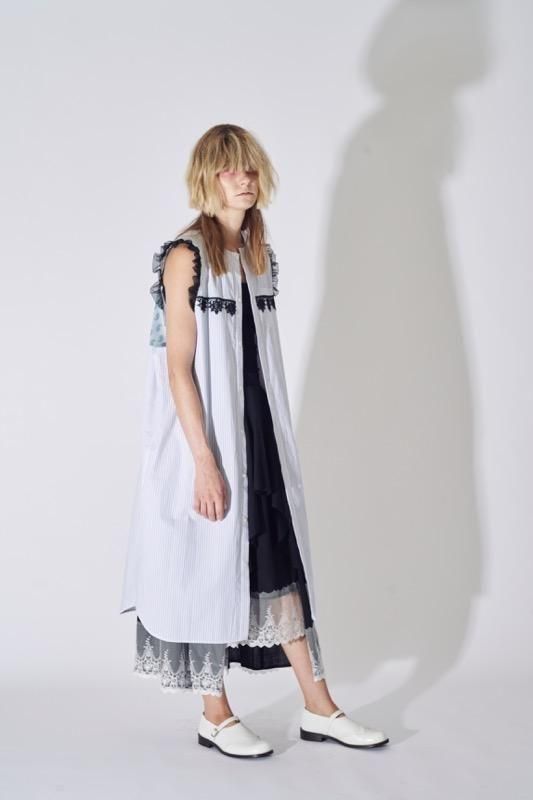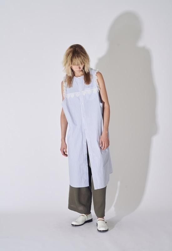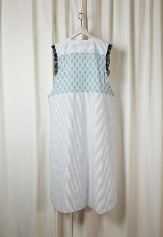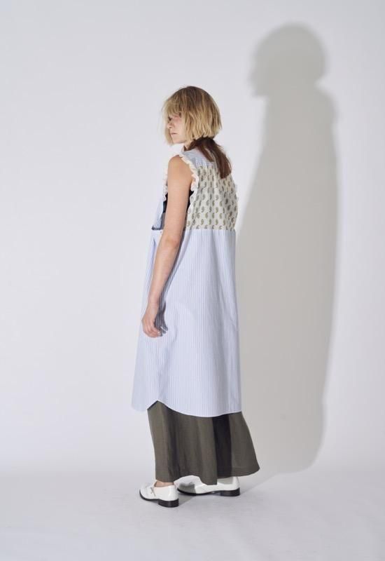 超長綿オーガニックコットンを100%使用してマニッシュなストライプシャツ地を作り、ワッシャー加工を施してドライなタッチを持たせています。インド綿ボイルの小花プリント、昔ながらの編機を使用した立体的なエンブロイダリーレース、極細のチュールなど、さまざまな要素を1枚にミックスさせた主役級のワンピース。