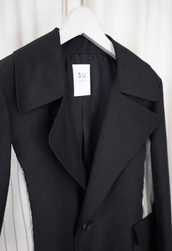 大きめの襟のデザイン、レジメンタルストライプの切り替え、異素材ポケットなど、ディテールにもこだわった1枚。