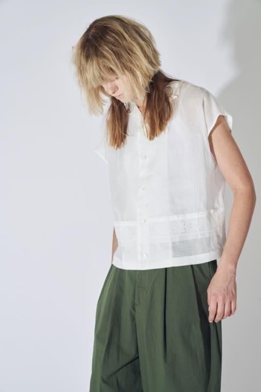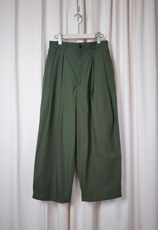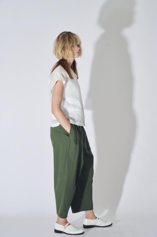 綿ウールの混紡糸を使用した打ち込みの良い生地を何回も揉み込んで芯からほぐしたナチュラルな表情とソフトで優しい肌触りの素材。軽くてはき心地の良いパンツを作りました。