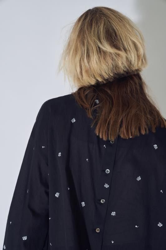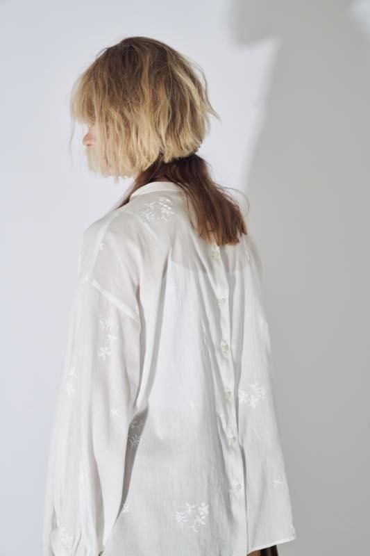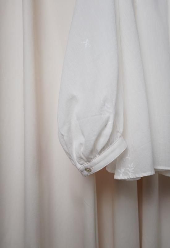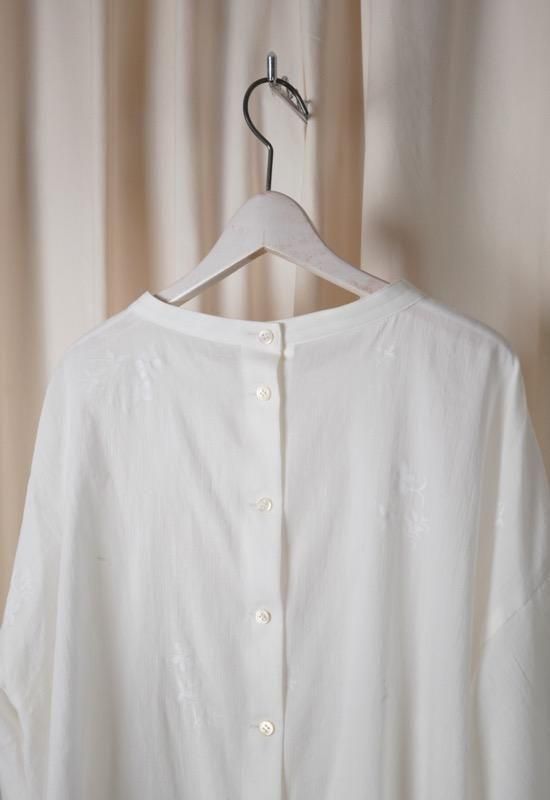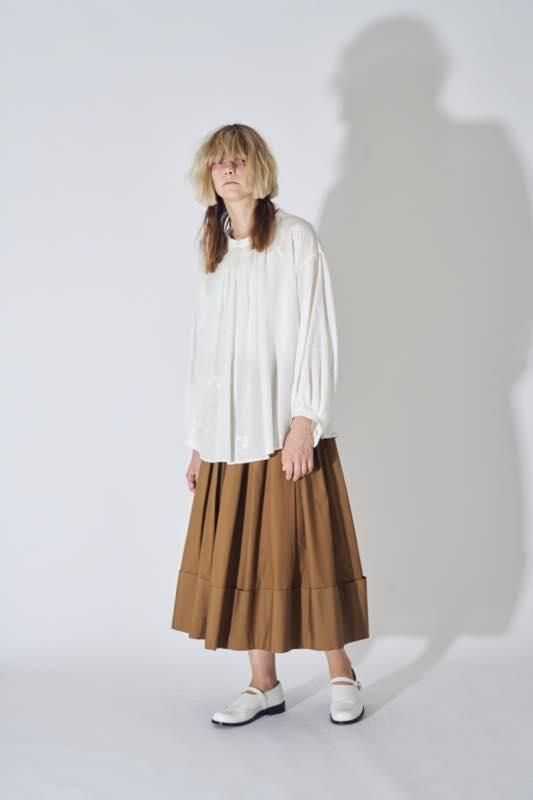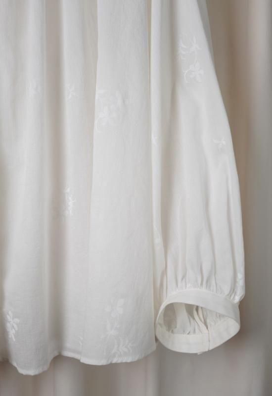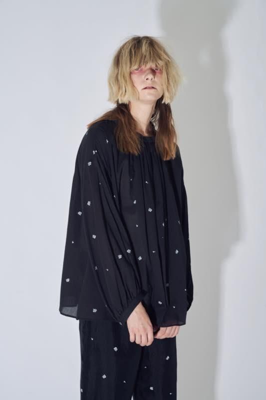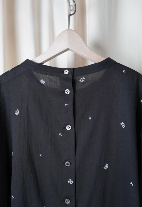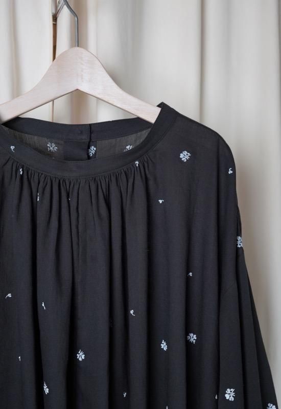 オーガニックコットン混の糸を使用してエアリーなアムンゼン素材を作りました。熟練の職人さんが版画のように生地にプリントする手捺染という手法でクラシックな小花の柄を顔料プリントしました。透明感のある優しい風合いを持つ素材で、ホワイトとブラックで小花の柄が異なります。